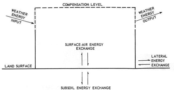 In thermodynamics it is always necessary to define the system to which reference is made. In our examples we shall be concerned with systems of varying size, and all these systems shall be "open" in that some sort of communication will exist with the surroundings. The smallest type of system we shall consider is a restricted region of Earth's surface of the order of a kilometer or less in dimension and with a vertical dimension of the order of several kilometers, including the subsoil and overlying atmosphere. We shall consider particularly the energy flux through such regions before and after they are modified by technology. The largest system of interest is the entire surface region of the planet, including the atmosphere and oceans. This region, encompassing the entire biosphere, is the region of ultimate pollution dissipation and the region penultimate energy dissipation. The biosphere is practically closed with respect to pollutants themselves, but as these become increasingly degraded, their energy is radiated into space.