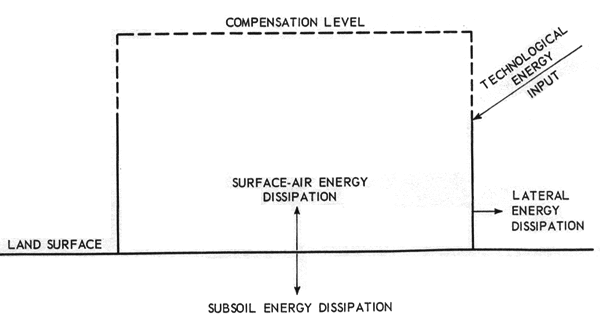 Figure 1-b shows the technological energy input and the equivalent energy dissipated outward in a modified region. This figure refers to the simple case of an "isolated modified region."