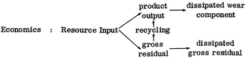 is apparent. The term "gross residual", taken from Cumberland et al (1970), is defined as all by-products of production which are waste materials. We observe that just as there is dissipated energy component Q2, which may be diminished by increased efficiency, so there is a gross residual of production, which may in part be reclaimed. Similarly to the case of useful work or energy the product output is eventually entirely dissipated into the environment as "wearout." Just as energy becomes increasingly unavailable toward the right in the diagram, so also the value of goods are diminished as they wear out.