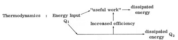 It is interesting that although we speak of a quantity of useful work W, and the corresponding thermal efficiency, neither of these concepts has any direct meaning as far as the environment is concerned. First of all it is clear that W depends on the way it is measured and on what we regard as useful work. The environment, on the other hand, sees only Q1 , all of which must be dissipated or stored. Thus in boring a hole in a steel block, we expend Q1, obtain W and reject Q2. However W is transformed to other energy forms such as the heat of friction, which must be dissipated. This heat may appear as thermal pollution in addition to that produced by Q2. We may then ask what effect on the environment does efficiency have? The answer is that the effect of an increased W/Q1 is to require a smaller Q1 to accomplish any given task that we regard as "useful." The smaller the Q1, the smaller the quantity of pollution and environmental impact for any given process. Thus the environmental impact of engine efficiency depends not on W/Q1, but on Q1. An obvious conclusion, which is not exactly new, is that the environment would benefit from the absence of technology.