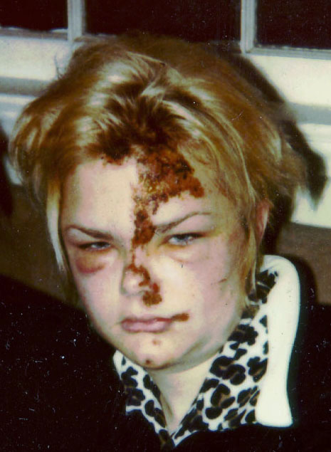 Yesterday Jessika loaned me a polaroid of her face which was taken shortly after the accident on Carter's Mountain (see the December 23rd entry). I have scanned it for the enjoyment of all. The picture at left is how her face looked a year ago; I have included it for comparison. Click on the image at right for a nice big gory version of her post-accident face. In those days she really lived up to her email address of uglygirl@hotmail.com.