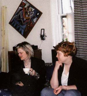 Jessika contemplates drinking the tussin with a look of disgust. Deya looks on. The painting in the background is one of mine called Wrong Room.