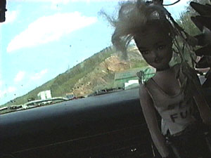 The alterna-chick Barbie doll prepared by Jessika for the Dodge Dart. Note the "Big Fun" logo on her tee shirt. |