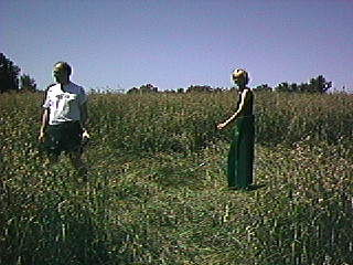 Durwood (Wacky Jen's friend) examines a crop circle with Wacky Jen.