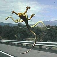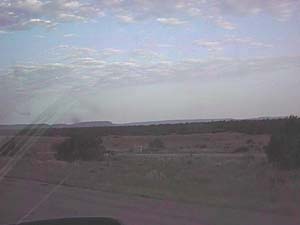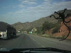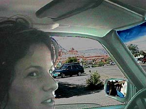 We stopped for overpriced gas and (for me) more coffee in Clines Corner and continued westward. The mountains drew closer. I remarked to Kim that they didn't look especially bigger than eastern mountains. From the distance they looked very much the same, though up close it was apparent they were really very big indeed and covered not with trees but bushes spaced at a certain regular frequency. Kim told me a little about what it's like to live in New Mexico, since she lived in Santa Fe in the summer of 1997 studying massage and teaching dance. She said that the earth tones of the arid landscape pervade absolutely everything and figures heavily into architecture and decoration. Looking out the window as the villages and settlements rushed past, I realized that even the most modern homes were made to look as if they were adobe shacks. Overpasses and other large concrete and metal structures were tinted, stained, painted or dyed to make them seem forged out of the landscape itself. After hours of looking at these colours, it all began to look like unfired pottery. East of Albuquerque the mountains were fully upon us, but instead of going up through any high pass we stated to go downhill dramatically among tightly-spaced steep mountain peaks dappled regularly with arid bushes. I had never seen something so distinctly western in my life.
