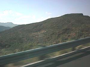im originally wanted to get a hotel room in Sedona, but the crowds convinced her we should continue down to Phoenix and stay tonight with her aunt Rhonda. So we found our way back to I-17 and continued southward. The cellular phone proved useless in the low desolate mountains through which we passed. Gradually the plants changed. Ovoid cacti grew increasingly numerous, along with a kind of bush that appears to photosynthesize mainly with its swollen green stems (not its tiny vestigial leaves). The juniper-type bushes grew fewer and fewer in number until they all but disappeared.