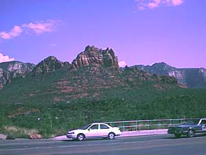 nce we got onto 89A southbound headed towards Sedona, we passed down out of the pines down tight switchbacks to the bottom of the Oak Creek Canyon. Incredibly beautiful vistas of red rock cliffs, each eroded into unique buttes and spires, opened up around every bend. It was much more impressive than I had expected. Originally I hadn't wanted to take this scenic detour, but now I was glad I had. I made extensive use of the Volvo's extra gear ranges as I did the descent, saving the brakes for some future day. I could smell the burning brakes of those less wise. We stopped at a little deli market place for beers, a sandwich, and some particularly flavourless curried pasta. The woman who checked our IDs before selling us beers later saw Kim walking Sophie and commented that the dog must belong to Kim's mother. Interestingly, that was same impression I had the first time I saw Kim and Sophie back on July 11th. I looked at the big deciduous trees along the river and for a moment could fool myself into thinking I was in the East. But the trees were all wrong. For example, the sycamores had soft droopy deep green leaves, not the crisp, yellowing bug-eaten leaves of the Eastern Sycamore. Downtown Sedona lies several miles downstream in the ever-widening canyon in the shadow of especially stunning red rock landforms, each named after various 20th-Century pop culture icons. Sedona had the look and feel of a tourist trap, especially on this relatively crowded Labor Day. Grannies in loud shirts led grandchildren cautiously across the main drag on endless treks for trinkets and souvenirs. I contented myself by taking a few digital photographs.