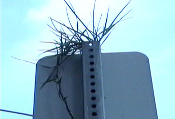 The other day I wrote about the opportunistic "post grass" growing in the perforated posts of urban Los Angeles (I've also seen it in San Diego). I told you I'd put some pictures up this weekend, but I only got to photographing it today. I found this particularly robust example of post grass growing in a parking sign post near the Café on Rochester Avenue.