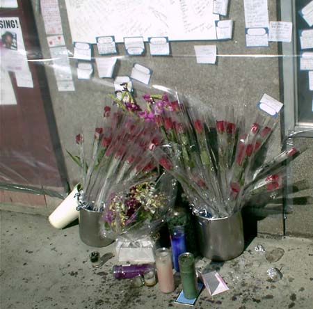 There are makeshift memorials all up and down Canal Street in vicinity of the Varick cross street. For an entire block there are many eight by four foot slabs of plywood leaning against a wall, and passersby are encouraged to write their story on a small piece of adhesive paper, which is then stuck beside many other such stories. At every corner are massive impromptu circular shrines of candles, flowers, and pictures. With well over 5000 people not yet accounted for, these shrines are liberally sprinkled with posters featuring pictures and descriptions of the missing. The convention is always to write as though these people really are missing and will eventually return. Some of the posters directly address the missing people, telling them "We love you very much, please come home." It's somehow horrible and beautiful at the same time. One can't dwell long within this enormity of loss without starting to feel it.