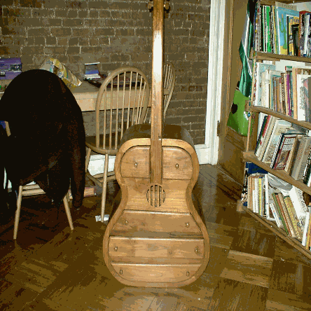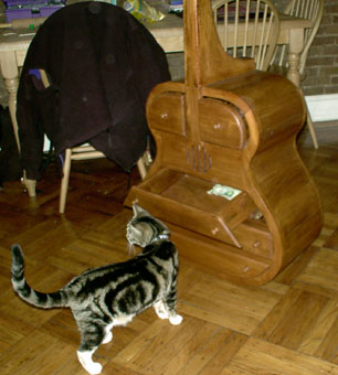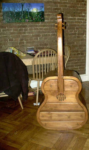 Shortly after Art showed up, Gretchen arrived with Park Slope Anna. Anna had contributed her car to the effort of helping Gretchen pick up her new cello-shaped chest of drawers from the antique store. The cello looked unexpectedly good in the dining room, though we still don't know where to put it. We photographed it and even made a brief stop-action animation.