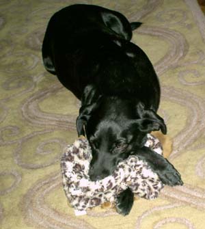 Sally with her favorite toy - a padded leopard-print