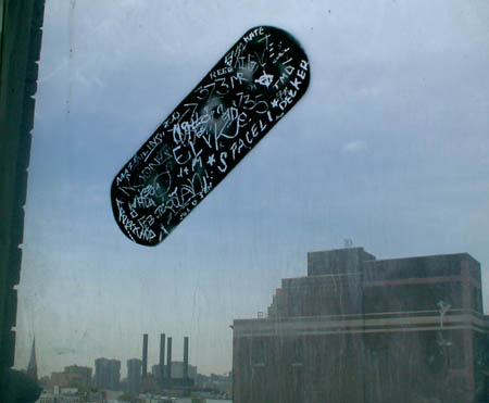 A sticker in the room adjacent to the roof at PS1.