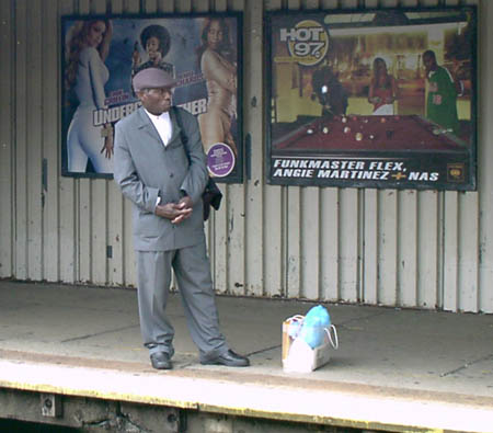 Man waiting for the 7 train to Manhattan from Long Island City, Queens.