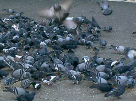 Pigeons swarming for unusual provisions in Long Island City.
