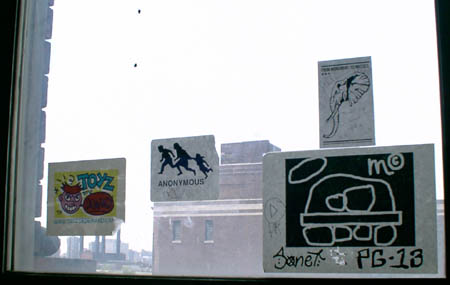 Stickers in the room adjacent to the roof at PS1.