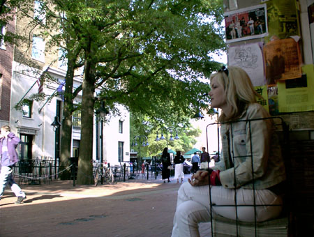 At five o'clock I returned to the Downtown Mall to rendezvous with Jessika, who was planning on us cooking ourselves dinner somewhere. By the time I'd arrived at the Jefferson Theatre, the plans had changed slightly and now a gentleman named Fast Eddie was going to be doing all the cooking and Jessika and I were just going to sit back and drink Yellow Tail Shiraz, Jessika's new favorite red wine. Fast Eddie has been in the Charlottesville scene for years, though I've never really had any dealings with him. As you might imagine from his name, most people regard Fast Eddie as a shady, suspect figure. Fast Eddie used to hang out at the Rising Sun Bakery back in the day and I remember Elizabeth including him in her list of regulars she had to actively discourage. Anyway, more recently Fast Eddie has successfully ingratiated himself with some at the Jefferson, particularly Jessika and my old Dynashack housemate Andrew. Recently Eddie and Andrew decided (on a whim) to launch a business of digging up trees from country roadsides and selling them to wealthy gardeners downtown. So far, though, the only notable result of their industry has been an outbreak of poison ivy rash for Andrew. While walking back to Jessika's Subaru Brat, we came across one of Saras' friends who told us that Saras and the Dirty Fingers people were having a barbecue at their place in the 'hood (a block or so west of Cherry Avenue in Charlottesville's notorious low-rent district). This sewed the seeds of confusion. Though Jessika would have preferred to go to this barbecue, there was apparently enough animosity between Saras and Fast Eddie that she doubted he would be allowed to join us. Later, back at Jessika's house, the fact that Saras didn't want Fast Eddie at her barbecue was confirmed by telephone. Fast Eddie took immediate offence to this news, attributing it to some seemingly trivial altercation over in Staunton. Evidently Fast Eddie hangs out in Staunton all the time, and one day he randomly came upon Jessika and Saras when they were strolling down Beverly Street there. Eddie attempted to give them the grand tour, but Saras rebelled, claiming she wanted to discover the town on her own. As he talked about Saras, Fast Eddie's vitriol built, not in the tone of his speech, but in the extremity of his words. He went from saying he didn't have "much use for Saras anyhow" to "tell Saras I hope she chokes on a chicken bone." Mostly, though, Fast Eddie talked about other things: his early life in Manhattan, how "far back" he and Jessika went ("ten years" being a 30-40% exaggeration), and, above all else, horse racing. Eddie talked about horse racing in the same relentless manner as my mother talks about horses generally. What is it about horses that makes its various enthusiasts into such bores? Say what you will about Fast Eddie's conversational fixation, at least it was multimedia. Periodically he'd fish a folded-up newspaper page out of his pocket and show it to us. It featured a large grainy color photograph of several horses running down a track. "Have you ever seen anything so beautiful in your life?" he'd ask. On the drive out to Foods of All Nations, Jessika told Fast Eddie that she'd decided she wanted to go to Sara's barbecue after all. Having been in the back of the Brat at the time, I didn't overhear the conversation, but this development didn't seem to be bothering Eddie all that much later as we shopped for Yellow Tail Shiraz (meanwhile, he was picking up a tube of calamine lotion for Andrew). Jessika dropped off Fast Eddie on the Downtown Mall on the way out to Saras' place. Like many rental properties in the 'hood of Charlottesville, Saras' house sits on a large yard surrounded by big trees. Rent is low because of the proximity of impoverished African-American communities. After we'd parked, we were immediately joined by Josh Mustin1, who had also received late word of the barbecue. Strangely, though, there wasn't anyone else at the house. We came upon a barbecue grill with some hot ash-colored charcoal briquettes as well as at least one greasy paper plate, but there were no human beings. The back door was unlocked, however, so we went inside and made ourselves at home in the living room, soon drinking the Yellow Tail Shiraz in its entirety and moving on to a larger bottle of cheaper-tasting stuff not imported from Australia. Meanwhile Josh Mustin was arranging most of the entertainment, playing a Ramones video and an example of some audio production he did for a local punkabilly band (that band that opened for the Dirty Fingers on Friday, I forget their name). Josh claims he's been doing a lot of music production lately using some equipment he has access to. In the case of the song he was playing for us ("Psycho Taxi Driver" or something like that), he'd recorded sound samples of cars revving their engines and layered them in various places on top of the band. To my untrained ear it sounded very professional. After awhile we decided to bring out the house dog (some sort of Sharpie mix), because it was lonely and whimpering in somebody's bedroom. When I was petting it, I stuck my fingers well into its ear canals to where things get nasty with earwax. It's something that dogs (and even some cats) love, but I could tell I was grossing Jessika out. We did make a few attempts to call places where Saras and the Dirty Fingers might be, particularly Millers. To make these calls, we were using a random cell phone we found on the floor. It must have been Saras' phone too, since it didn't have her number in its address book. We had no luck in tracking her down. Once we'd had enough of the living room, we all took turns contributing to a sign left for the house's occupants taped to the television set. Most of the sign's content consisted of random phrases derived from Fast Eddie's angry remarks this evening and things Saras had said with drunken abandon on Friday night. We drove down to the Downtown Mall to see what we
