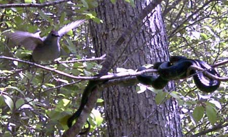 A catbird confronting a small blacksnake outside my Shaque just before I left for Charlottesville today.