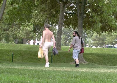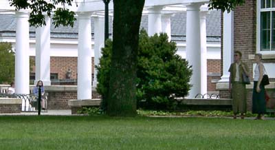 My hangover was so horrible today that after I walked to UVA's Cocke Hall, all I could do was print out some articles and then read them out on the lawn whilst drinking a Diet Coke, the only beverage available in the Cocke Hall drink machine. Further worsening my mood, I'd received an email from my mother saying that her horse was dying. She didn't say which horse, but I assumed it was her new Arabian Rica, who had been sick a few days ago. In my emotionally-fragile hungover state, I felt unusual empathy for my mother, and after sending her my condolences, I wrote Gretchen an email telling her how upset my mother must be. During the hours I lay on the lawn, I began noticing patterns in the things people were doing. There was something happening somewhere within Old Cabell Hall (the building at the lowest end of the UVA lawn) that was attracting smartly-dressed young women, but whatever this thing was, it was something that only drew a few at a time over a very long period. Meanwhile, a number of geeky-looking men kept appearing behind sailing frisbees which, after landing, they would ultimately hurl at the statue of Homer. It looked to me as if they were playing a frisbee-based version of golf. I've seen people playing this same frisbee game in Brooklyn's Prospect Park too, and I know the people who play it tend to be especially no-nonsense about it. One time in Prospect Park Sally grabbed a fall frisbee golf frisbee and I thought its owner was going to hit me (or at least slap me) as I returned it to him. There actually was an independently-minded dog running around today while the frisbees were flying and it didn't seem like he belonged to anyone. When he grabbed one of the frisbees, though, one of the geeky frisbee people yelled at him. A Charlottesville bicycle cop rode leisurely past me and lingered for awhile within view and I wondered if perhaps he was taking note of my presence on the Grounds. It's not like the cops know who I am and as far as I know I'm not even persona non grata at UVA, but there's still no telling the extent of police interest in my presence in town. Hangover, you see, brings its own special paranoia. What's more, I found myself incapable of rehearsing a credible, legitimate explanation for my presence on the lawn. All the same, I was too weak to get up and relocate, so I took my chances where I was. Happily, nothing bad actually happened.