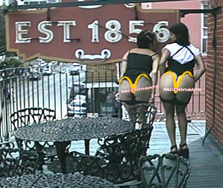 1I use the term "thong creamingly" for a very good reason. The thong is the new underwear of choice of the Monica Lewinsky-Britney Spears generation, most famous for their virginity pledges and advertiser-induced fancy for boy bands. Though I have a normal-to-slightly-abnormal fetishistic interest in women's underwear, this interest does not extend to thongs. When I close my eyes and imagine thongs, the picture of thin straps arching over a supple young rump easily morphs into the twin lobes of a McDonalds arch, reminding me of the chief failing of today's youth: their slavish adherence to the dictates of advertisers.