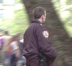 A cop prowls the audience at the Tompkins Square Park DJ performance,