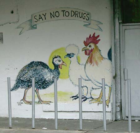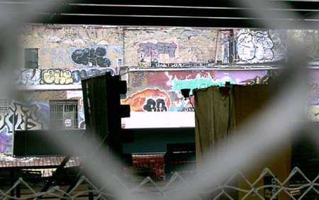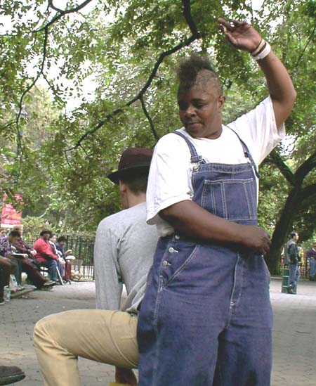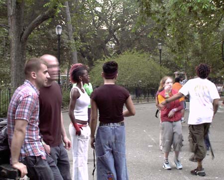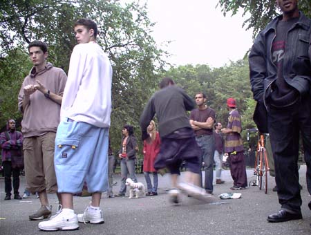 Today I went on another of my solo adventures around New York. First I rode the subway through Manhattan to the Brooklyn neighborhood of Williamsburg to get a sense of how the place looks on a Saturday afternoon. I also wanted to see if Jessika was correct when she relayed something Morgan Anarchy had told her: that non-ironic mullets are becoming fashionable amongst Williamsburg hipsters. I climbed up out of the L station on Bedford Avenue and proceeded to walk north to McCarren Park, keeping an eye peeled for mullets amongst the people on the street. Nearly all of them were hip white 20-somethings, though the closest things I saw to mullets were two stringy quasi-rattails. Looking around at the layers of graffiti, blowing street garbage, vacant industrial lots, and hipsters again comfortable (if not financially) in their post-dotcom slackerdom, I realized that gentrification in Williamsburg is likely to unravel. You can't support a community of 20-something slackers with coffeeshops and hip boutiques; short of an aberration like the dotcom bubble, you need something to bring in the real money, the parental money: something like a university. Unlike Park Slope, I can't really imagine Williamsburg being gentrified by parents hoping to raise children; the unkempt residences just don't seem particularly parent-friendly, at least not in the parts I've seen. (I've walked through the Hasidic neighborhoods in the past.) After I'd been through McCarren Park I headed south again, this time on Driggs Avenue (pronounced, I'm sure, the way I used to pronounce "drugs" when affecting a 1970s-era gangsta accent). Cutting over to Bedford again, I continued all the way to the Williamsburg Bridge, and then proceeded to cross the East River to Manhattan via its pedestrian walkway. As I did so, I ran across multiple parties of Hasidic or otherwise Orthodox Jews going to or coming from the Lower East Side of Manhattan (though Gretchen tells me that few distinctly Jewish things remain there). Looking at the structure of the Williamsburg Bridge close up, I was struck by the thinness of the vertical supporting cables that reached straight up to grab onto the long, thick, curving suspension cable. For all that iron - the eight lanes of highway and two sets of track, it just didn't seem like enough cable. But then again, I've never really figured out how a bicycle wheel can keep its shape with the seemingly-meager support of its spokes. Once in the Lower East Side, I headed west to Bowery and then north as far as Union Square, where I sat for a time reading the Village Voice and watching some students trying to film a young woman "actress" interacting with a fountain. They kept shooting one take after another, some involving the spraying of water, and she was becoming increasingly drenched. It couldn't have been too comfortable, given the overcast and unseasonable chill in the air (it was definitely sweater weather, reminiscent of San Diego's June Gloom). Eventually I walked down into the East Village, bought a 40 of Colt 45 (or is that actually 45 ounces?), and continued on to Tompkins Square Park. There I came upon an unexpected festival centered around a DJ and his sound system pumping extremely repetitive dance music into the dreary grey afternoon air. A substantial crowd of people had gathered there, some dancing, others just standing or sitting around. I quickly found a bench and filled my plastic coffee mug with malt liquor, kicked back, and enjoyed the scene. Before long I noticed that the guy sitting to my right was enjoying a can a Budweiser, telling shrouded as it was within a small brown paper bag. The fact that Tompkins Square Park had a festive atmosphere conducive to drinking did not pass the notice of the men in blue. Since the mayorship of Rudolf Giuliani, the police have enforced public drinking ordinances in New York despite a long tradition of tolerance for the practice. Not long after one of their white vans rolled up, a cop came up to the guy to my right and ordered him and at least two other people to come with him. Though I had my plastic mug full of malt liquor right there in my hand, he completely ignored me. This was my best proof yet of the value of coffee paraphernalia in the pastime of successful public drinking. After dealing with the cop, the guy came back and told me and his girlfriend that he'd received a summons and might have to end up paying ten dollars for his crime. "Oh, so it's really nothing more than a hassle," I observed. Though my thoughts were flowing clearly, I found it somewhat difficult to formulate proper sentences when speaking. Later as the DJ wound down his show, I went up near the stage and took a few pictures with the casual matter-of-factness of a genuine photographer. People were unexpectedly nonchalant about someone snapping pictures so aggressively. Indeed, some took it as an opportunity to chat with me, and I told them truthfully that it was for a web thing. Later on I went to the Holiday Cocktail lounge and had two Budweisers while talking to some random guy at the bar about nothing in particular. From there I relocated to a posh bar near Union Square called The Belmont Lounge, which is adjacent to that dark divey place that Gretchen and I like, the one with the pool tables that plays whole CDs of rock and roll. I've been calling the divey place "the Belmont Lounge," but I guess I've been wrong, because the real Belmont Lounge is this snooty place geared to the tavern needs of young professional Manhattanites. Anyway, after two Jack Daniels on the rocks, I was starting to piss people off. There was a girl having a birthday party back in the back room and she kept asking me if I knew anyone there and of course I didn't, but this fact wasn't making me feel even the slightest bit sheepish. What got me kicked out of the bar was my accidentally knocking a pane of glass out of a framed photograph hanging on the wall. I leaned against it and could feel it come