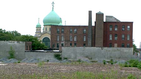 Some sort of Eastern Orthodox church in Williamsburg, viewed across an abandoned industrial site.