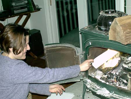 In the evening Gretchen ceremonially burned all the paperwork related to her brownstone and then we took our celebration to the Hurley Mountain Inn. There we indulged in fancy drinks and genuine entrees (as opposed to our usual meal of cheese pizza, french fries, and - for me - beer). As part of our celebration, we decided to buy drinks for everyone then sitting at the bar (which amounted to five or six white guys). Unexpectedly, this propelled us immediately to the status of hero, and in return this one guy named John sitting at the bar insisted on buying us drinks. He also got to talking to Gretchen and seemed interested when she told him about my home computer repair business. So I went out to the car to get some flyers so he'd have my contact info.