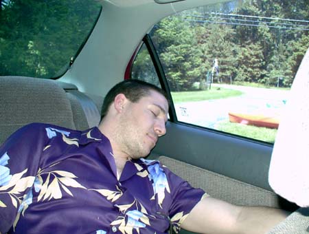Mark asleep in the backseat at the canoe merchant's place.