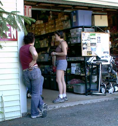 Lin and Gretchen discussing canoes with the canoe merchant.