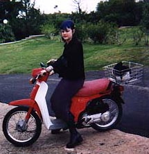 Jessika on a stylish modern iron scooter in Bermuda, Christmas 1998.