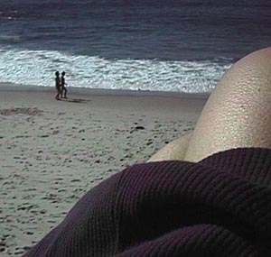 Kim worries about whether people can see her panties while a couple walk by on the shoreline below. Note the goosebumps caused by cool ocean breezes. You can't see it in this picture, but the male member of the shoreline couple has a haircut that would have been very cool back in 1982. This section of La Jolla shoreline features treacherous rocky shores and occasional seals, but you cannot see any in this picture.