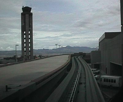 We ate our lunch in an overpriced Sports Bar right there in the terminal. I hadn't been outside of California since September and it came as a little bit of a surprise to smell cigarette smoke and see ash trays in the restaurant. This may sound dumb, but I suddenly realized that I wasn't in California anymore! This was the wild west, or some bastardized form thereof. In my mind, and on the ground this seems to be the case, Nevada has all the wanton, arbitrarily bizarre craziness of California without any of the social responsibility. Las Vegas is the urban equivalent of sociopathy, its excesses tempered only by the altruism that can, to the naïve, appear to grow in the fertilizer of capitalism. Bearing out this point, our waitress offered us $1 shots of tequila with our beers. The waitress might well have assumed Kim was a hooker I'd just picked up; in Kim's ultra-urban outfit she sort of looked the part. (Further bearing out this point - but more along the lines of our contribution thereto - was a discrete sexual act Kim and I committed in a deserted swath of seats in the waiting area.)