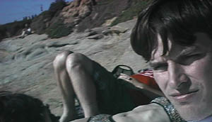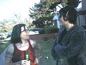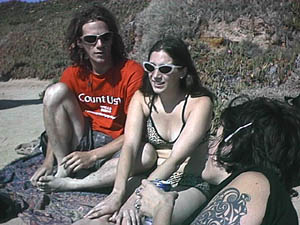 EJ took us to a party amongst some of his skater friends in southern Ocean Beach. The beer, which had supposedly been expensive and dark, was already gone, so we had to con a chick out of her freshly-purchased Rolling Rocks. For some reason I just sort of out of place amongst so many young skater types. As I told Kim, I was feeling "like an old man with knobby knees." Part of my problem was my attire: I was wearing a Calvin Klein teeshirt (made of unusually fine fabric) and khaki frat boy shorts.