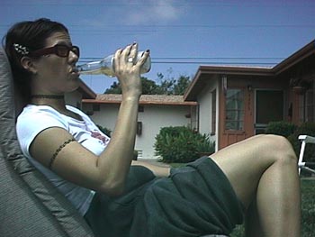 Kim sucks down a Corona in the courtyard.