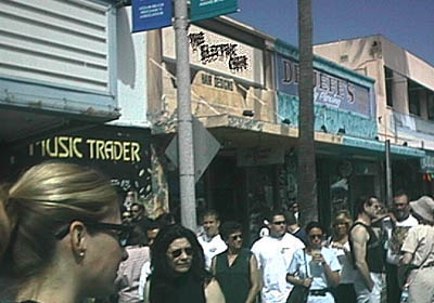 Given my hangover, the distraction of the party in our own courtyard (and a number of other factors including an episode of the television action-adventure series Hercules - which is great to watch when you're baked), it took us awhile to make it down to Newport. When we finally went, we quickly blew all ten dollars of our money at a gyro stand. When we saw the line in front of the bank machine, we knew we weren't going to have the funds to slake our thirst unless we made a return trip home.