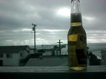 Another typical June gloom sunset viewed over the rooftops of Ocean Beach, with the international beer of summertime in the foreground.