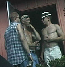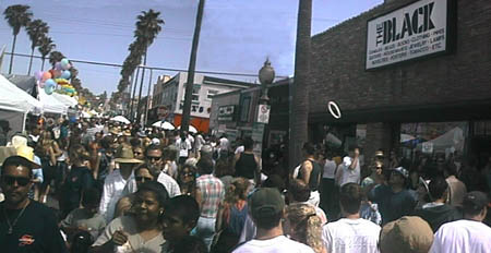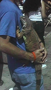 By now the gang hanging out at Jason's place was swollen with chums (and their girlfriends) whom he knows via his naval career. It was a leisurely festive scene, so we hung out with them in the courtyard for awhile. People were telling amusing stories as the sun (which, surprisingly, was out for most of the day) baked our hangovers into pink patinas upon our faces. Eventually my co-workers Kevin and Al called up from Kevin's cell phone trying to establish a rendezvous somewhere down on Newport Street, but we never found them when we finally returned to the street fair. But we did see several large iguanas, a number of Cockatoos, and an odd male-female "married dog couple." The female, a black labrador-mix, had enormous droopy teats and the male was a muscular, tawny partial-bulldog. "We have puppies," their master told us. There were also plenty of nubile betties on the hoof and I was certain that Kevin and Al, wherever they were, were having a wonderful visual experience.