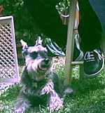 Sophie the Miniature Schnauzer somehow staying out of trouble in the shade beneath a couple of random girls who showed up at Jason's party.
