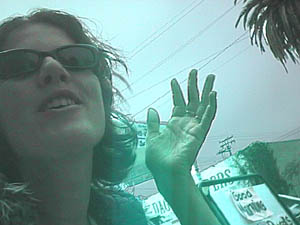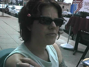 Kim in front of the Zen Bakery. In the background you can see the brightly-painted Voltaire Street wall of the burnt-out remains of the Dago Choppers Harley shop. Perhaps Dago Choppers was torched by operatives from an extremist Italian-American group.