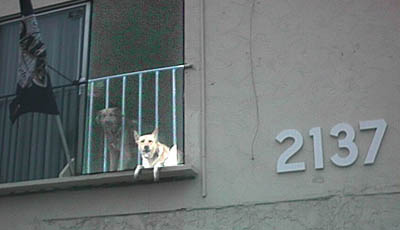 Some pissed off dogs in a second floor apartment look out over the beach at the end of Brighton Avenue, just south of Dog Beach in Ocean Beach.
