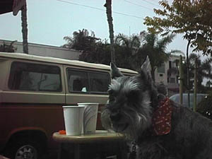 We decided to walk all the way to the ocean at Dog Beach. Naturally, Sophie was delighted when we arrived and I unleashed her upon the turd-studded sands (Rash compared it to a vast cat litter box). Sophie charged several times through fairly deep water to get out to a temporary tidal island and then back again, seemingly just as a demonstration that she could. There were a few big dogs who were aggressive in their friendliness towards her, and she was intimidated. But her social skills were sound. When she'd notice a big dog on her tail, she'd stop and face him (as opposed to letting him chase after her). The vast majority of the dogs seemed to have only the best intentions. But as we sat on the beach watching the gleeful dogs charging about after Frisbees and socializing in the surf, we'd hear an occasional dog fight break out. One of these left a Greyhound whimpering pathetically, but he recovered amazingly rapidly shortly thereafter.