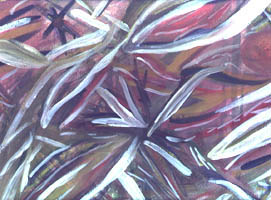 After picking up some provisions from the pathetic little Ocean Beach art supply store, Kim and I stayed inside most of the afternoon, both of us painting. Kim started out with watercolour and moved on eventually to acrylic. I'd been telling her from the start to just use acrylic, since they're the most responsive & forgiving of media result-wise. The fact that children start out in school doing watercolour seems to have convinced a lot of people that watercolour is the easiest type of painting, the way to get started on an artistic career. But they're overlooking the fact that watercolour is chosen as a child's first paint media because it is the most forgiving of media material-wise, not result-wise. A watercolour brush accidentally left out to dry can be recovered. A neglected acrylic brush, on the other hand, is a total loss. One must have compulsively clean habits when using acrylics or the cost of working with them quickly becomes prohibitive. I was a little concerned that perhaps Kim was too much of a kosmonaut to use acrylics, that the phone would ring and that would be the end of another $20 brush. So I warned her and warned her and told her about the need to develop compulsive cleanliness habits, and this all seemed to pay off.