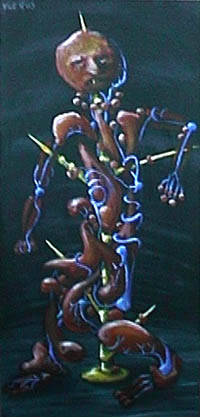 I finished the painting I've been working on, which you see photographed at right. I started on it back on Thursday. All comments so far have been positive, though there are always some people who need explanations for the seeming violence represented in my dissected ruins of extemporaneously conjured corpses.