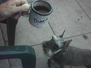 Sophie was somewhat intimidated by the grab bag of dogs all standing at the back door eager (within the refinements of their various social skills) to meet her. Eventually she did get to meet a few of the least aggressive ones, though their friendliness was also something of a threat and soon she was jealously chasing them away from both Kim and myself. Everything was just dandy as we discussed the way the dog boarding operation was run. The only glitch came as Kim was filling out the form and the Dog Lady asked what she should do in case the unthinkable happened and Sophie needed to be put to sleep. Kim had to go to the bathroom to stop her unseemly crying.