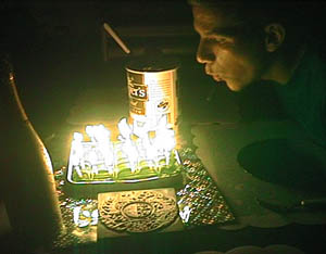 In the evening Steph and EJ cooked up a dinner of shark. (EJ had received the shark steaks as a "tip" while operating his bike cab in downtown San Diego.) Later Kim brought out a birthday cake and we celebrated EJ's 27th birthday for the second day in a row. Here's the key to lighting 27 candles on a cake: start in the middle and work outwards. I nearly lost all the hair on my knuckles doing it the wrong way, and we only had 24 candles to work with.