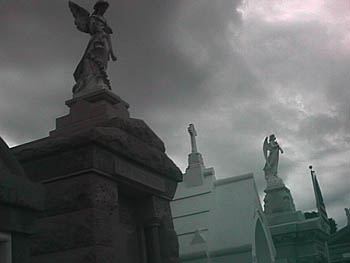 The museum wasn't far away, so Kim and I headed towards it on foot. Along the way we stopped to take pictures in a graveyard, a common subject of amateur photography in New Orleans. Like everything else in the city, there's something a bit odd about the way the dead are buried. They can't simply be chucked in the clay; they'd eventually come bubbling back up with the ground water after such simple disposal. Instead they're placed in small stone houses like the rich people in other places. Graveyards in New Orleans consist entirely of such buildings. Those who cannot afford their own stone houses are entombed in concrete communal mausoleums. In a very real sense the graveyards are "cities of the dead."