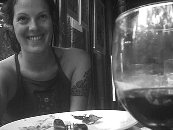 Eventually Kim and I made it out of "our apartment" and down to Café Degas on Esplanade and sat down to dine in what must usually be a breezy patio area. But since it was a humid, rainy day, the patio was mostly sealed up behind stout transparent plastic drapes. All the waiters were older white men, and ours seemed especially well-connected with the local art scene, shall we say. He must have been doing his job particularly well today because somehow he convinced me to say what the hell and order the $30 bottle of a California Merlot (as opposed to the $18 bottle).