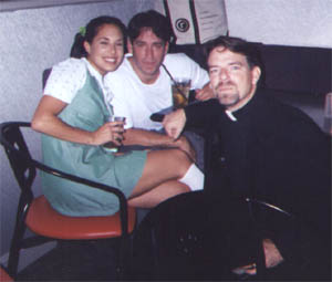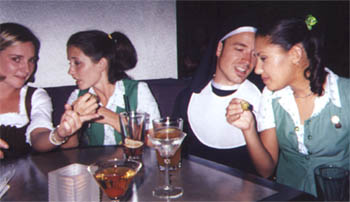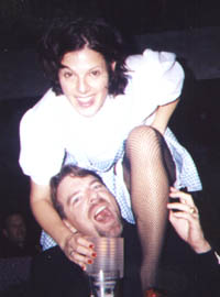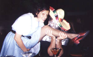 I kiss Kim's fishnet stockings. The sombrero belongs to Peter the Developer.