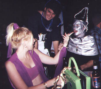 At around lunch, a group of a dozen of us (or so) headed down to San Diego State University to visit briefly with Theo. Theo is big-haired surfer dude from Pacific Beach who works seven days a week as a field campus marketer, and it's his job to organize and run the down-and-dirty student-recruitment operation. His methods are varied, but today he was giving away free slices of pizza to students who would sign up and become members on the web site we've built for them. As he looked over the operation, Dmitri wasn't impressed, saying, "College kids don't want a slice of pizza. They want to get laid! We ought to be handing out free condoms and displaying pictures of attractive members!" Dmitri isn't the only one who is dubious about our company's grassroots efforts. For one thing, many of the members who are signed up at kiosks these days do so upon computers that aren't even hooked up to a network; they're stored in a local MS Access database which is synchronized with our central database at a later time. Whether or not these people ever actually go to our site is seriously at issue. Nothing much happened while we were there except for repeated comments made by my male co-workers concerning the beauty of the many young female students. Kevin the DBA was, as usual, the one most affected; beautiful women seem to cause him something akin to pain.