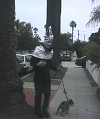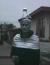 My plans for being some sort of Wizard of Oz Tin Man for Halloween ran into a few problems this morning. There's only so far you can go with duct tape and tin foil. A metallic hat I'd made last night was, at best, simply the outline of a Tin Man hat. So I just said fuck it and went on something of a costume tangent, only beginning with the idea of being metallic. With Kim's help, I put together an outfit consisting entirely of Kim's clothes. One of these was a form-fitting pair of black pants overlain with a silvery grid design. Kim's most silvery article of clothing was a simple leather miniskirt (a hand-me-down from Aunt Betty) which looked good over my shoulders. I tucked my hair into a tinfoil & duct-tape cap beneath that weird abstract woodsman's cap and painted my face silver using some of Steph's aluminum powder face paint. Finishing touches included a string of plastic beads and a little hollow-headed Lego action figure strung on bicolour telephone connection wire around my neck. I ended up looking like a metallic superhero. Kim and I walked Sophie around the block as I made a few last minute additions and alterations and little kids waiting at the bus stop waved at me like I was some sort of celebrity they couldn't quite place.